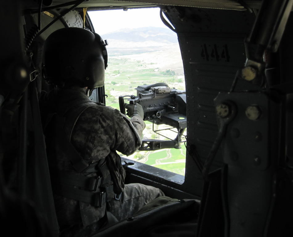 U.S. Army crew chief looks out for possible threats from the UH-60 Blackhawk while traveling from combat outpost to the next. Combat Outpost Margah, Paktika province, Afghanistan, April 21. (Photo by Russell Hampsey)