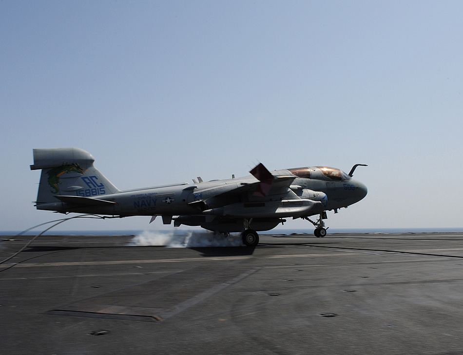 ARABIAN SEA (Oct. 5, 2010) An EA-6B Prowler assigned to the Zappers of Electronic Attack Squadron (VAQ) 130, catches an arresting wire during the morning recovery cycle aboard the aircraft carrier USS Harry S. Truman (CVN 75). VAQ-130 is deployed as part of the Harry S. Truman Carrier Strike Group supporting maritime security operations and theater security cooperation efforts in the U.S. 5th Fleet area of responsibility. (U.S. Navy photo by Mass Communication Specialist Seaman Ryan McLearnon)