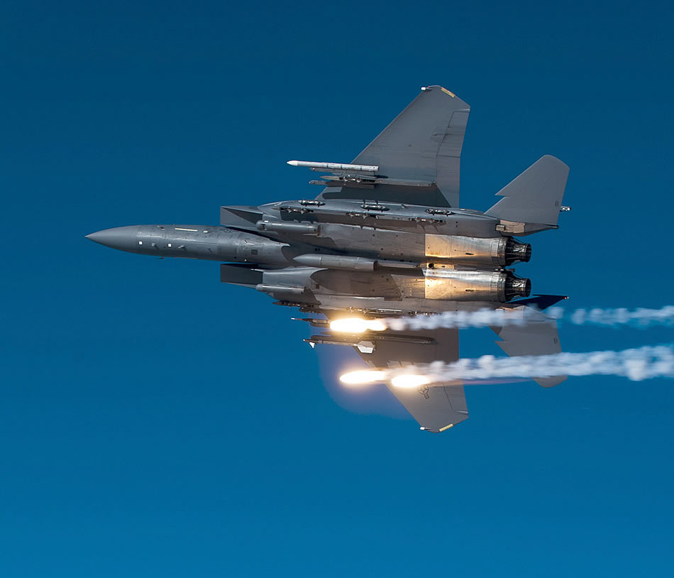 Flares are released from an F-15E Strike Eagle during a local training mission Dec. 17, 2010, over North Carolina. The F-15E is from the 335th Fighter Squadron from Seymour Johnson Air Force Base, N.C. (U.S. Air Force photo/Staff Sgt. Michael B. Keller)