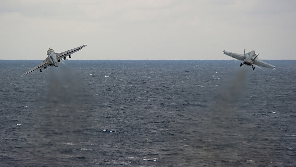 PACIFIC OCEAN (Jan. 7, 2011) An EA-6B Prowler assigned to Electronic Attack Squadron (VAQ) 134 and an F/A-18E Super Hornet assigned to Strike Fighter Squadron (VFA) 81 launch simultaneously from the bow and waist catapults on the flight deck of the aircraft carrier USS Carl Vinson (CVN 70). Carl Vinson and Carrier Air Wing (CVW) 17 are on a deployment to the U.S. 7th Fleet area of responsibility. (U.S. Navy photo by Mass Communication Specialist 2nd Class James R. Evans)