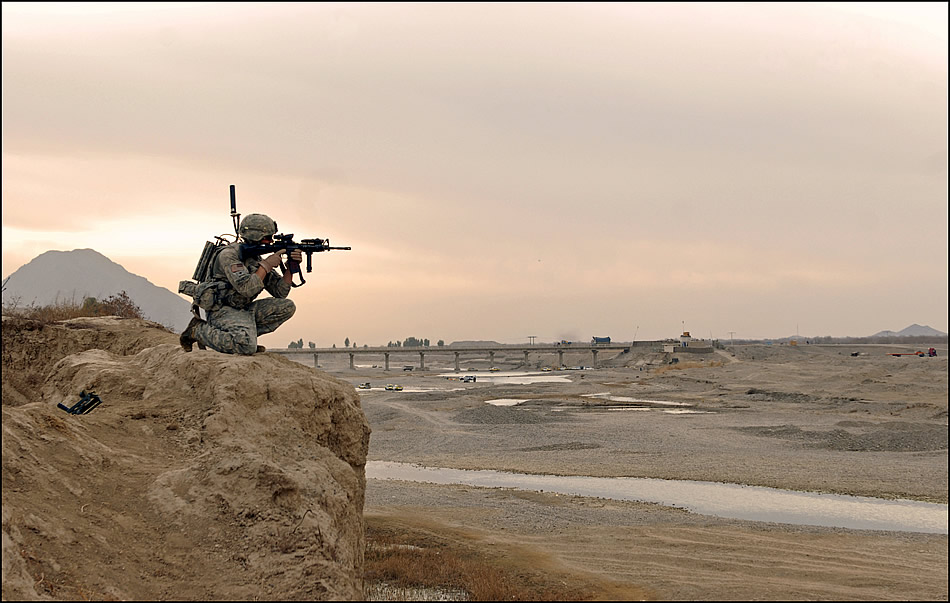 Spc. Nicholas Francioso, armored crewman, assigned to 2nd Squad, 3rd Platoon, Company C., 1st Battalion, 66th Armored Regiment, 1st Brigade Combat Team, 4th Infantry Division, kneels atop a cliff overlooking the Arghandab River Valley Jan. 31, to provide security for his squad as they climb up the cliff from the valley below. Francioso, a native of Cleveland, Ohio, was conducting a foot patrol with his squad to search orchards throughout the district and interact with the local population. During their foot patrols, 2nd squad must maneuver their way through the Arghandabs many obstacles, including: farmer-built mud walls, irrigation canals, densely populated orchards, foot-wide pathways through long stretches of boggy flats and even a 30-foot-tall wall they must climb during their patrol. Photo by Spc. Breanne Pye