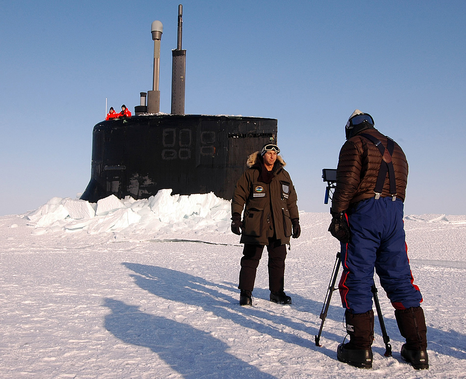 ARCTIC OCEAN (March 26, 2011) CNN correspondent Kaj Larsen films a documentary segment in front of the sail of the attack submarine USS Connecticut (SSN 22) after the submarine surfaced through the ice in the Arctic Ocean during Ice Exercise (ICEX) 2011. (U.S. Navy photo by Lt. Ed Early)