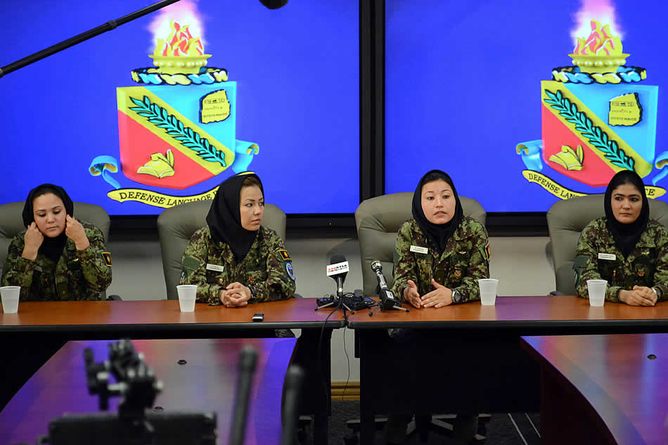 Four Afghan helicopter pilot candidates attend a press conference July 13, 2011, at the Defense Language Institute English Language Center at Lackland Air Force Base, Texas. The women begin their English language studies at the DLIELC, marking a significant milestone in shaping the reconstruction of Afghanistan. (U.S. Air Force photo/Staff Sgt. Desiree N. Palacios)