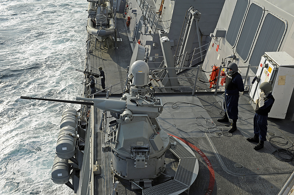 RED SEA (Jan. 5, 2012) Sailors assigned to the small craft action team aboard the Arleigh Burke-class guided-missile destroyer USS Dewey (DDG 105) man their stations while the ship transits the Strait of Bab Al Mandeb. USS Dewey is deployed to the U.S. 5th Fleet area of operations conducting maritime security operations. (U.S. Navy photo by Mass Communication Specialist 3rd Class Joshua Keim)