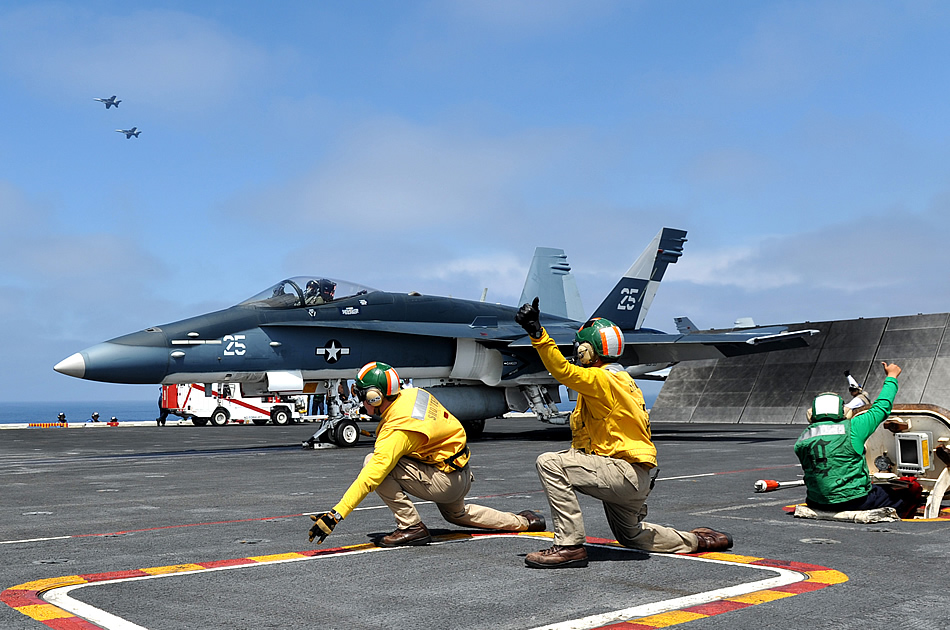 PACIFIC OCEAN (Aug. 11, 2012)An F/A-18A Hornet assigned to the Flying Eagles of Strike Fighter Squadron (VFA) 122, a fleet replacement squadron for the F/A-18A and F/A-18D legacy Hornets, prepares to launch from the aircraft carrier USS Nimitz (CVN 68). Nimitz is underway conducting fleet replacement squadron carrier qualifications in the Pacific Ocean. U.S. Navy photo by Mass Communication Specialist 3rd Class Ryan J. Mayes