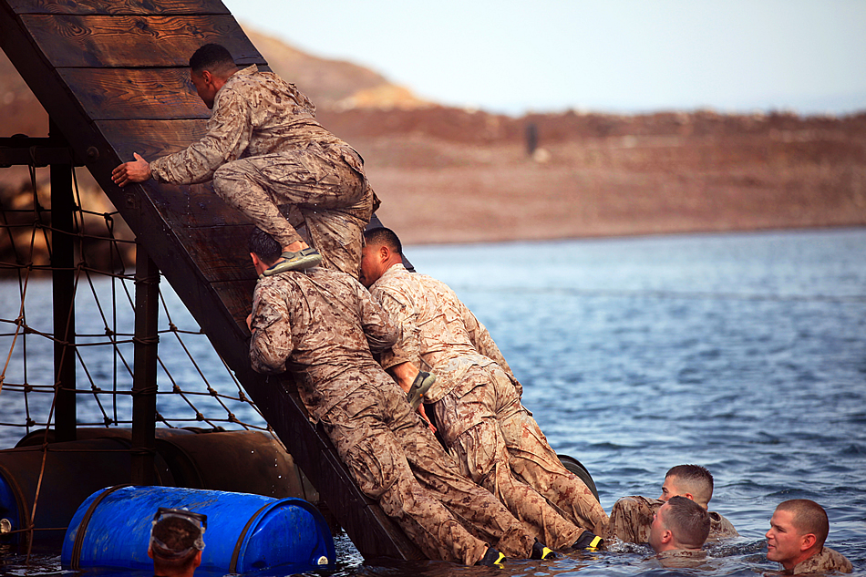 U.S. Marines navigate an obstacle during a water obstacle course at Arta Beach in Djibouti, Aug. 11, 2012. The Marines, assigned to the 24th Marine Expeditionary Unit, took part in the course, which was hosted and supervised by members of the French 5th Marine Regiment. A contingent of the 24th MEU is currently ashore in Djibouti conducting various unilateral exercises and planning several events alongside the French military. U.S. Marine Corps photo by 2nd Lt. Joshua Larson