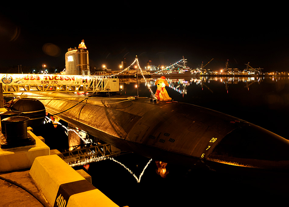 JOINT BASE PEARL HARBOR-HICKAM, Hawaii (Dec. 22, 2012) The Los Angeles-class attack submarine USS Tucson (SSN 770) is lit up with Christmas lights and ornaments during the holidays. (U.S. Navy photo by Mass Communication Specialist 2nd Class Steven Khor)