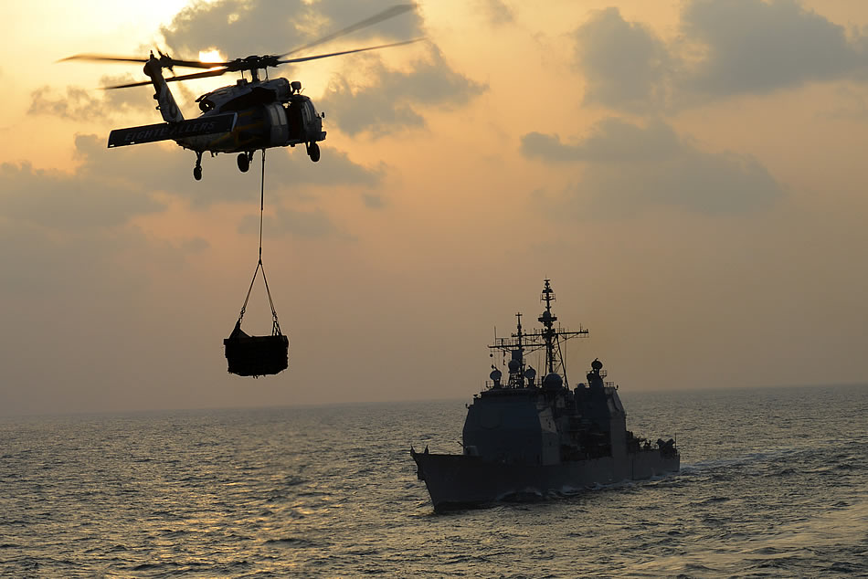 U.S. 5TH FLEET AREA OF RESPONSIBILITY (Jan. 8, 2013) An MH-60S Sea Hawk helicopter from the Eightballers of Helicopter Sea Combat Squadron (HSC) 8 flies with cargo past the guided-missile cruiser USS Mobile Bay (CG 53) during a replenishment-at-sea with the Military Sealift Command fast combat support ship USNS Bridge (T-AOE 10). Mobile Bay, assigned to the John C. Stennis Carrier Strike Group, is deployed to the U.S. 5th Fleet area of responsibility conducting maritime security operations, theater security cooperation efforts and support missions for Operation Enduring Freedom. (U.S. Navy photo by Mass Communication Specialist 2nd Class Kenneth Abbate)