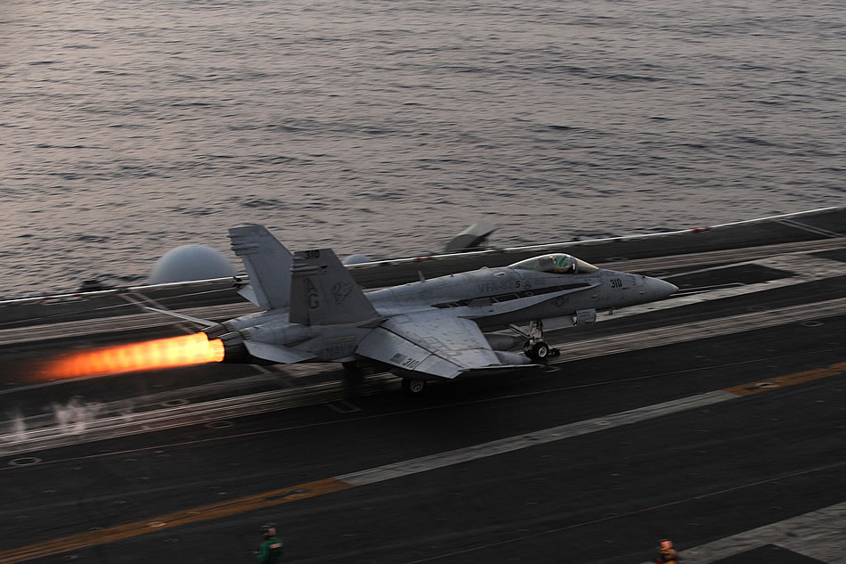 RED SEA (March 18, 2013) An F/A-18C Hornet assigned to the Rampagers of Strike Fighter Squadron (VFA) 83 launches from the flight deck of the aircraft carrier USS Dwight D. Eisenhower (CVN 69). Dwight D. Eisenhower is deployed to the U.S. 5th Fleet area of responsibility promoting maritime security operations, theater security cooperation efforts and support missions as part of Operation Enduring Freedom. (U.S. Navy photo by Mass Communication Specialist 2nd Class Ryan D. McLearnon)