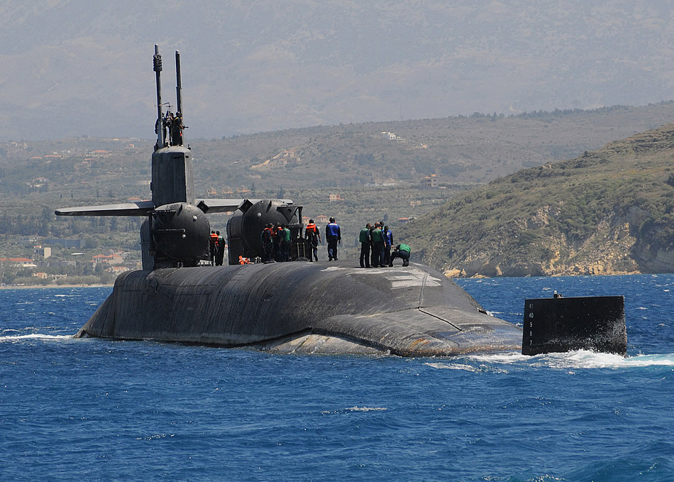 SOUDA BAY, Greece (May 24, 2013) The Ohio-class guided-missile submarine USS Florida (SSGN 728) departs Souda harbor after a routine port visit. Florida, homeported in Kings Bay, Ga., is deployed conducting maritime security operations and theater security cooperation efforts in the U.S. 6th Fleet area of responsibility. (U.S. Navy photo by Peggy Bebb)