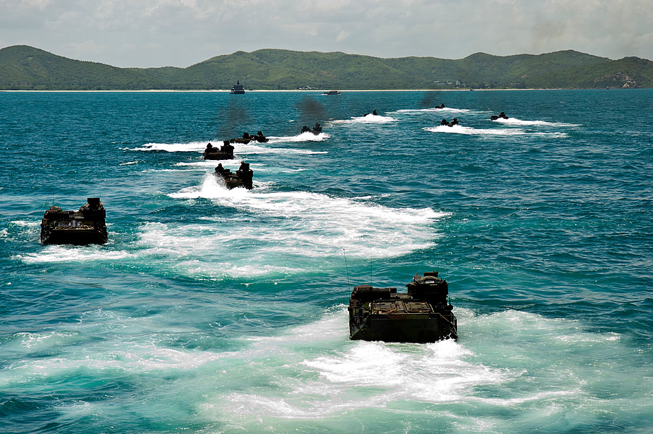 GULF OF THAILAND (June 10, 2013) Amphibious assault vehicles approach Hat Yao beach in preparation for a joint amphibious assault exercise with the Royal Thai Navy as a part of exercise Cooperation Afloat Readiness and Training (CARAT) Thailand 2013. CARAT is a series of bilateral military exercises between the U.S. Navy and the armed forces of Bangladesh, Brunei, Cambodia, Indonesia, Malaysia, the Philippines, Singapore, Thailand and Timor Leste. (U.S. Navy photo by Mass Communication Specialist 3rd Class Amanda S. Kitchner)