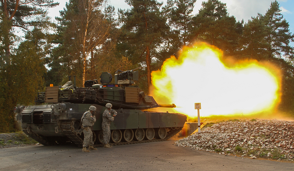 Sgt. 1st Class Joseph Maughon, right, the master gunner for Company C, 2nd Battalion, 12th Cavalry Regiment, 1st Brigade Combat Team, 1st Cavalry Division and Staff Sgt. Scott Colson, left, a tank commander in Company C, 2nd Bn. 12th Cav. Regt. remote fire a tank during calibration fire at Grafenwoehr Training Area, Germany, Oct. 1. (U.S. Army photo by Capt. John Farmer, 1st BCT, 1st CD Public Affairs).