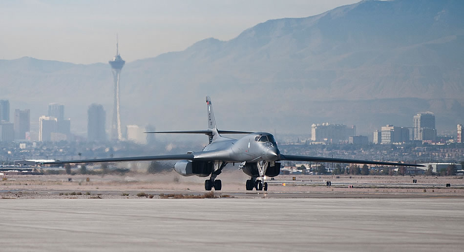 A B-1B Lancer taxis to its parking spot after landing Nov. 18, 2014, during Green Flag-West 15-02 at Nellis AFB, Nev. The B-1's blended body configuration, variable-geometry wings and turbofan afterburning engines combine to provide long range employment, maneuverability and high speed while enhancing survivability. The B-1B is assigned to the 34th Bomb Squadron, at Ellsworth Air Force Base, S.D. (U.S. Air Force photo/Staff Sgt. Siuta B. Ika)