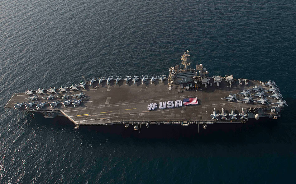 ARABIAN GULF (June 28, 2015) Sailors spell out #USA with the American flag on the flight deck of the aircraft carrier USS Theodore Roosevelt in honor of the Independence Day weekend. Theodore Roosevelt is deployed to the U.S. 5th Fleet area of operations as part of Theodore Roosevelt Carrier Strike Group supporting Operation Inherent Resolve, strike operations in Iraq and Syria as directed, maritime security operations and theater security cooperation efforts in the region. (U.S. Navy photo by Mass Communication Specialist 3rd Class Jackie Hart)