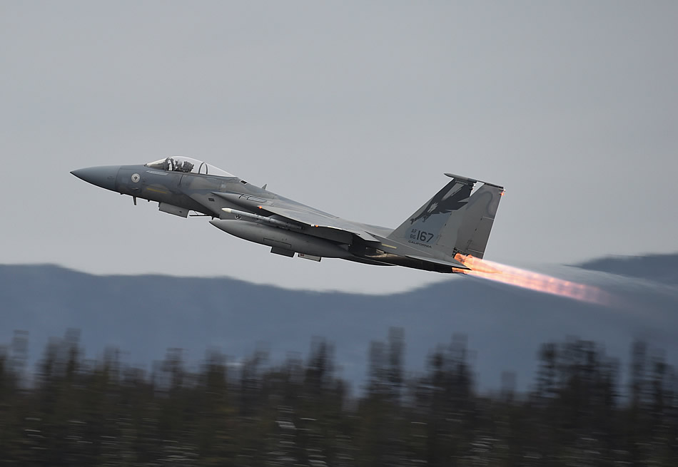 A F-15C Eagle, piloted by 1st Lt. Johnathan Pavan from the 144th Fighter Wing out of Fresno, Calif., takes off from 5 Wing Goose Bay, Canada, while participating in exercise Vigilant Shield 16 Oct. 20, 2015. From Oct 15-26, approximately 700 members from the Canadian Armed Forces, the U.S. Air Force, U.S. Navy and the U.S. Air National Guard are deploying to Iqaluit, Nunavut, and 5 Wing Goose Bay, Newfoundland Labrador, for Vigilant Shield 16. (U.S. Air National Guard photo/Senior Master Sgt. Chris Drudge)