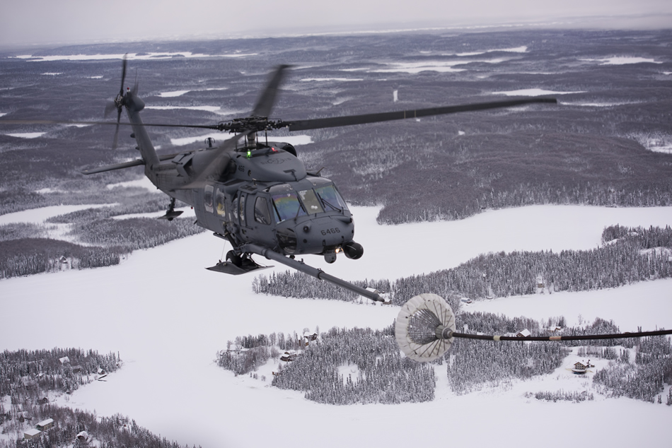 Col. Harlie Bodine, commander of the 611th Air and Space Operations Center, U.S. Air Force, spent the day with the 176th Wing, Alaska Air National Guard’s rescue squadrons during an immersion flight, Nov. 24, in and around the JBER area. The purpose of the immersion flight was to provide Bodine the opportunity to have first-hand experience with the missions and capabilities of the 210th, 211th and 212th Rescue Squadrons, which are often tasked by the Alaska Rescue Coordination Center to execute search and rescue missions across Alaska as part of their civil search and rescue commitment. The day’s demonstrations included an air refueling mission in which an HH-60G Pave Hawk helicopter was refueled by an HC-130 King aircraft, as well as a hoist extraction demo from a Pave Hawk.(U.S. Air National Guard photo by Staff Sgt. Edward Eagerton)