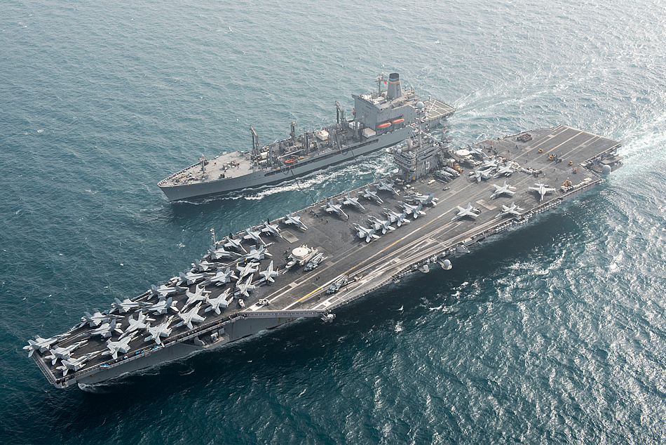 ARABIAN GULF (Feb. 24, 2016) Aircraft carrier USS Harry S. Truman (CVN 75) participates in a replenishment-at-sea with fleet replenishment oiler USNS Pecos (T-AO 197). Harry S. Truman Carrier Strike Group is deployed in support of Operation Inherent Resolve, maritime security operations, and theater security cooperation efforts in the U.S. 5th Fleet area of operations. (U.S. Navy photo by Mass Communication Specialist 3rd Class Bobby J Siens)