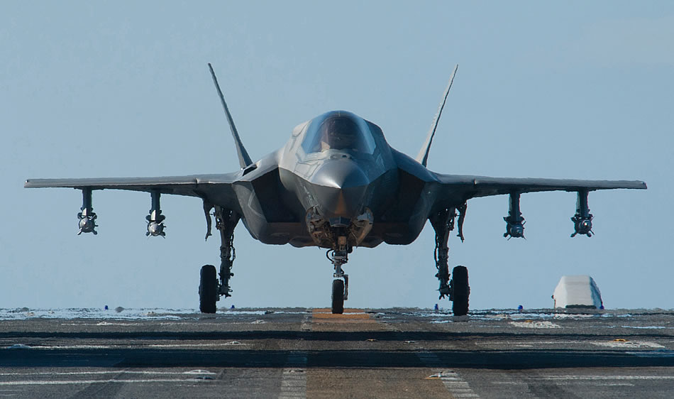PACIFIC OCEAN (Nov. 5, 2016) An F-35B Lightning II aircraft equipped with inert 500-pound GBU-12 Paveway II laser-guided test bombs prepares for takeoff from the flight deck of amphibious assault ship USS America (LHA 6) during flight operations. The F-35B short takeoff/vertical landing (STOVL) variant is the world's first supersonic STOVL stealth aircraft. America, with Marine Operational Test and Evaluation Squadron 1 (VMX-1), Marine Fighter Attack Squadron 211 (VMFA-211) and Air Test and Evaluation Squadron 23 (VX-23) embarked, are underway conducting operational testing and the third phase of developmental testing for the F-35B Lightning II aircraft, respectively. The tests will evaluate the full spectrum of joint strike fighter measures of suitability and effectiveness in an at-sea environment. (U.S. Navy photo by Petty Officer 3rd Class Kyle Goldberg)