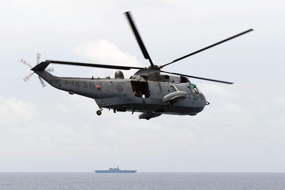 SOUTH CHINA SEA (June 10, 2017) A CH-124 Sea King helicopter assigned to Royal Canadian Navy ship HMCS Winnipeg (338) departs the Arleigh Burke-class guided-missile destroyer USS Sterett (DDG 104). Sterett is part of the Sterett-Dewey Surface Action Group and is the third deploying group operating under the command and control construct called 3rd Fleet Forward. U.S. 3rd Fleet operating forward offers additional options to the Pacific Fleet commander by leveraging the capabilities of 3rd and 7th Fleets. (U.S. Navy photo by Mass Communication Specialist 1st Class Byron C. Linder)