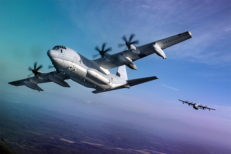 Marine Corps KC-130J Hercules aircraft conduct division tactical navigation training at Naval Air Station Whidbey Island, Wash., Aug. 14, 2017. The aircraft are assigned to Marine Aerial Refueler Transport Squadron 152 and Marine Aerial Refueler Transport Squadron 252. Marine Corps photo by Cpl. Joseph Abrego