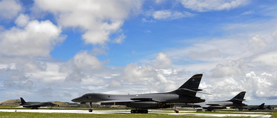 Twelve U.S. Air Force B-1B Lancers assigned to the 37th Expeditionary Bomb Squadron, deployed from Ellsworth Air Force Base (AFB), S.D. and the 9th EBS deployed from Dyess AFB Texas, line the airfield at Andersen AFB, Guam, July 31, 2017. The aircraft are deployed in support of U.S. Pacific Command’s Continuous Bomber Presence operations. These aircraft, and the men and women who fly and support them, provide a significant capability that enables our readiness and commitment to deterrence, provides assurances to our allies, and strengthens regional security and stability in the Indo-Asia-Pacific region. (U.S. Air Force photo/Tech. Sgt. Richard P. Ebensberger)