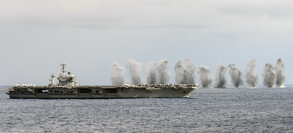 Aircraft from Carrier Air Wing 11 drop live ordnance during a flight demonstration as part of Tiger Cruise aboard the aircraft carrier USS Nimitz in the Pacific Ocean, Dec. 1, 2017. Navy photo by Petty Officer 3rd Class Jose Madrigal