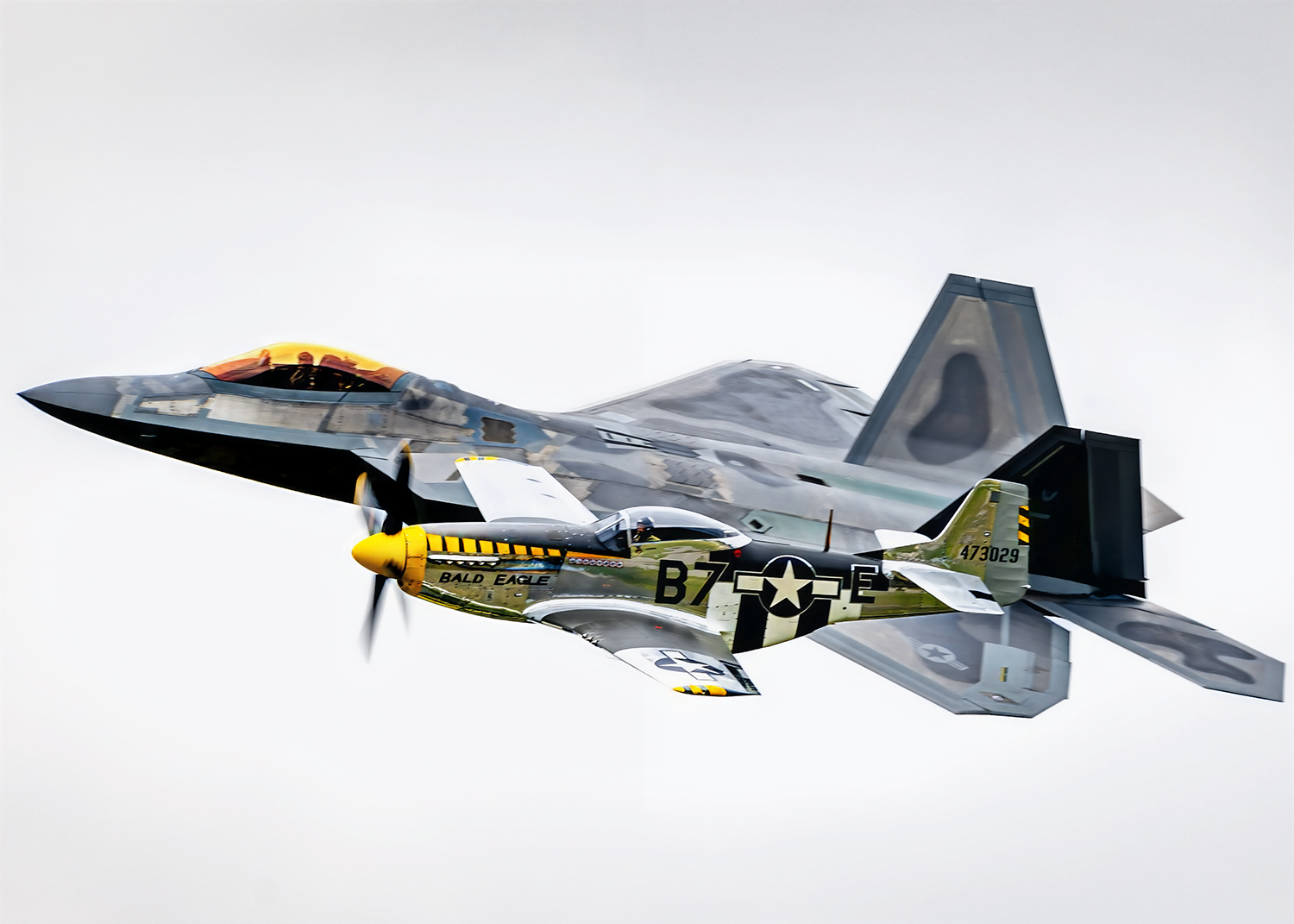 A U.S. Air Force F-22 Raptor performs an aerial demonstration alongside a P-51 Mustang during the Heritage Flight tribute at the New York Air Show in Montgomery, New York, Aug. 24, 2025. The Heritage Flight showcases both modern and vintage military aircraft to honor U.S. military aviation history and service members. (U.S. Air Force photo by Staff Sgt. Lauren Cobin)