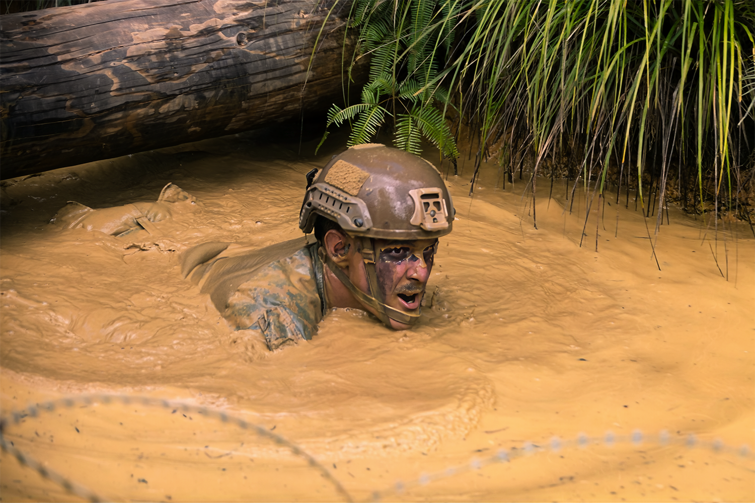 Nov 10, 2025, U.S. Marine Corps Staff Sgt. Jon Lizotte, a platoon sergeant with Animal Company, Battalion Landing Team 1st Battalion, 7th Marine Regiment, 31st Marine Expeditionary Unit, traverses the endurance course during the Basic Jungle Skills Course at the Jungle Warfare Training Center, Okinawa, Japan, Sept. 19, 2025. The week-long course instructed the Marines in basic jungle survival skills, tactical rope-suspension techniques, and jungle warfare tactics to enhance lethality in harsh jungle environments. (U.S. Marine Corps photo by Lance Cpl. Victor Gurrola)